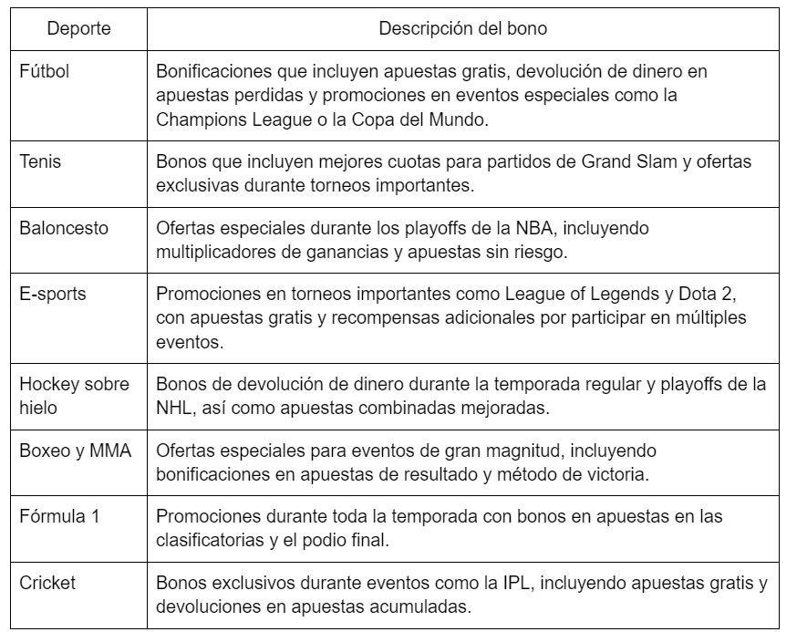 - Bonos específicos para deportes: para los aficionados a las apuestas deportivas, 1win ofrece bonos especializados que mejoran las apuestas en una variedad de eventos deportivos, aumentando las posibilidades de éxito y las ganancias potenciales.