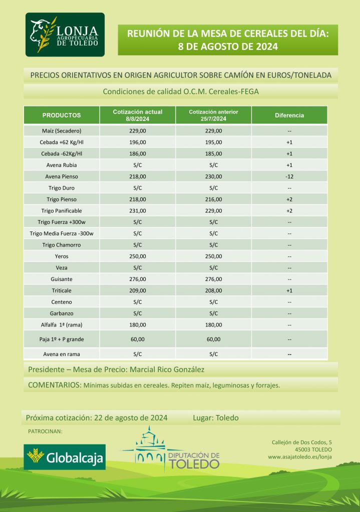 Lonja Agropecuaria de Toledo. Cereales. 8-agosto-2024