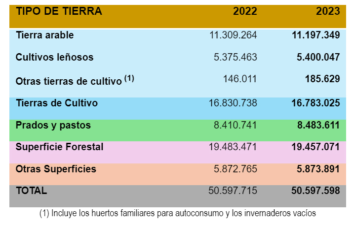 Las tierras de cultivo en barbecho manifiestan un ligero aumento (6,91 %) en su conjunto, mientras que los cultivos herbáceos han descendido un 3,11 % su superficie con respecto a 2022 por el decremento de cereales, tubérculos y cultivos industriales, fundamentalmente.