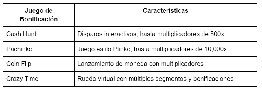 Los juegos de bonificación de Crazy Time son un gran atractivo, añadiendo capas de emoción y potenciales grandes premios. Cada juego de bonificación ofrece mecánicas de juego únicas y recompensas: