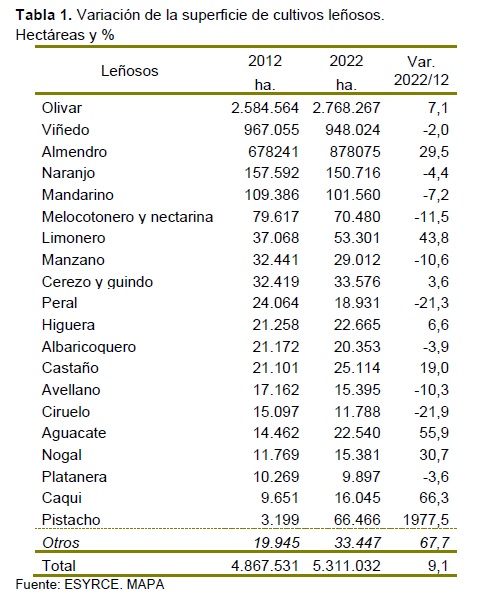 La dimensión de los cambios producidos se constata con el dato de que el 11 % de la superficie de cultivos leñosos registrada en 2022 (unas 550.000 hectáreas), estaba ocupada en 2012 por cultivos herbáceos (355.874 hectáreas) y barbecho (191.996 hectáreas). La caracterización de esta evolución: