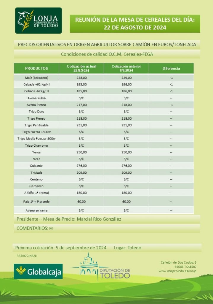 Lonja Agropecuaria de Toledo. Cereales. 22-agosto-2024