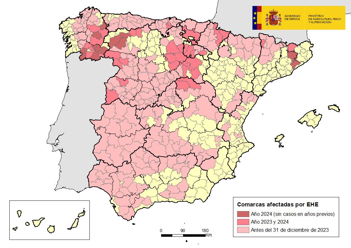 Desde la última actualización sobre la situación de la Enfermedad Hemorrágica Epizoótica (EHE) realizada el pasado 14 de agosto, los laboratorios regionales y el Laboratorio Central de Veterinaria (LCV) de Algete, laboratorio nacional de referencia para esta enfermedad, han confirmado la presencia de enfermedad en varias explotaciones de bovino localizadas en las comarcas de Lugo y Fonsagrada (Lugo); Ourense, Baixa Limia y Terra de Celanova (Ourense); Santo Domingo de la Calzada (La Rioja); Villacarriedo y San Vicente de Toranzo (Cantabria); Sanguesa, Elizondo y Ochagavía (Navarra); Aranda de Duero (Burgos); Burgo de Osma y Almazán (Soria); Tábara (Zamora); Boñar y Astorga (León) y Vallès Oriental (Barcelona). Estas comarcas ya habían resultado afectadas en 2023, excepto Fonsagrada, Terra de Celanova, Baixa Limia, Astorga y Vallès Oriental (Granollers).