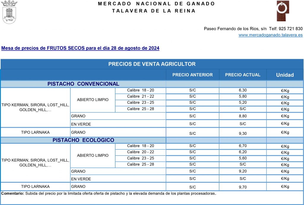 En concreto, en su sesión del 28 de agosto, desde la lonja talaverana señalaban que los precios van al alza por la limitada oferta de pistacho y la elevada demanda de las plantas procesadoras.