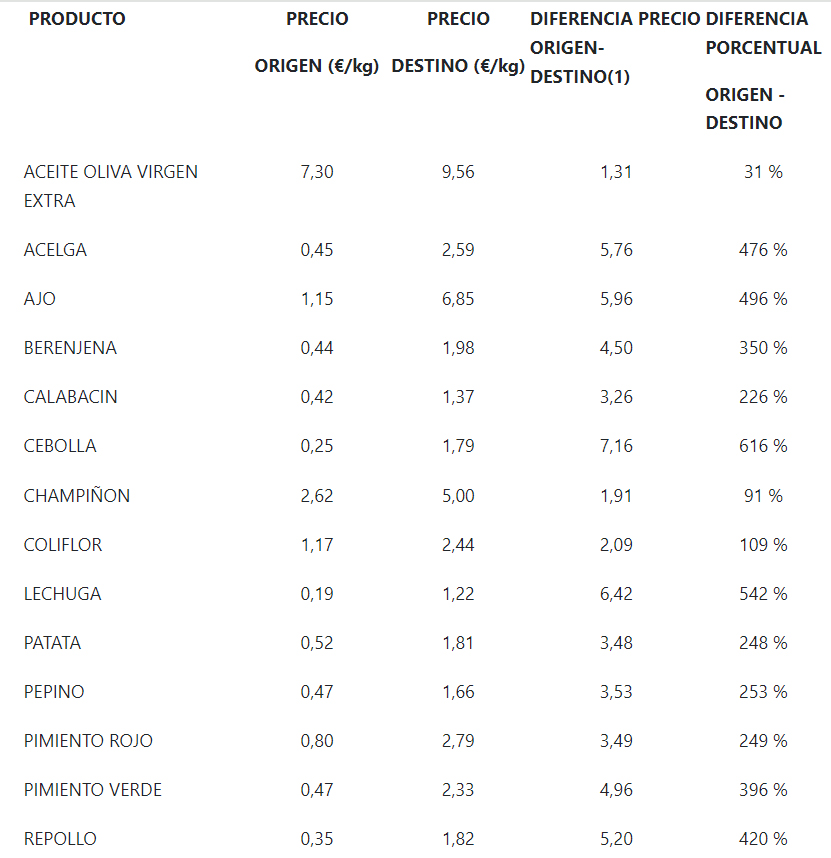 Entre los alimentos con mayores incrementos en toda la cadena sobresalen: el plátano, que se encareció un 666 % entre origen y destino; la cebolla (616 %), la lechuga (542 %), el ajo (496 %), la ciruela (494 %), la acelga (476 %), y la zanahoria (469 %).