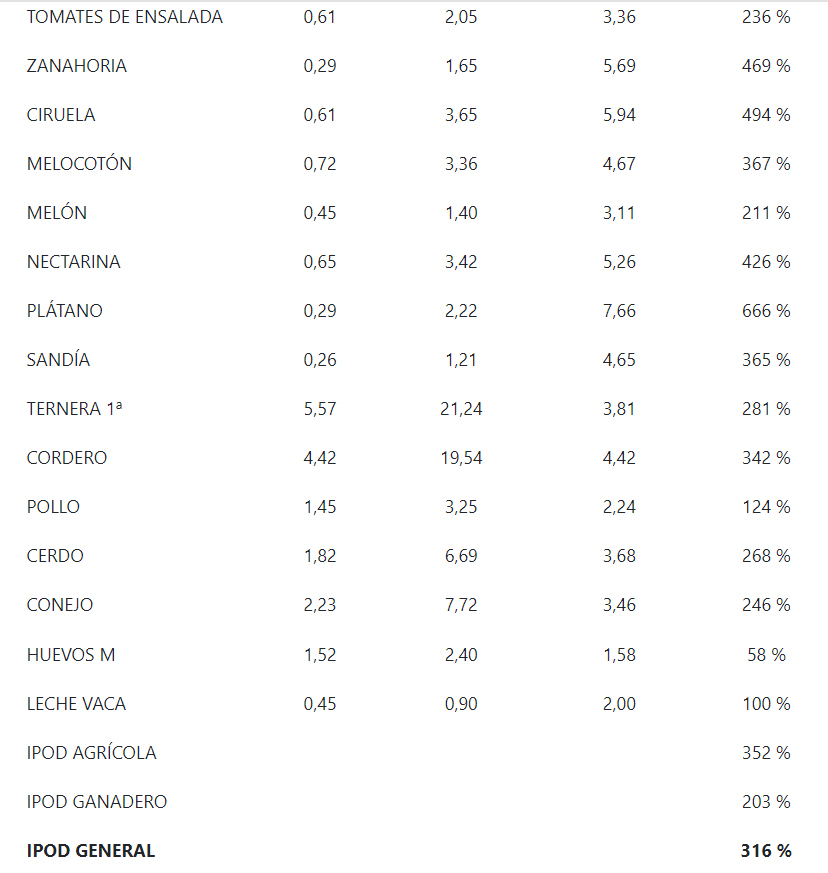 EFEAGRO. El precio de los alimentos subió un 316 % desde su origen en el campo hasta el consumidor el pasado agosto, según el último informe del Índice de Precios en Origen y Destino (IPOD) que ha difundido este martes la organización agraria COAG.