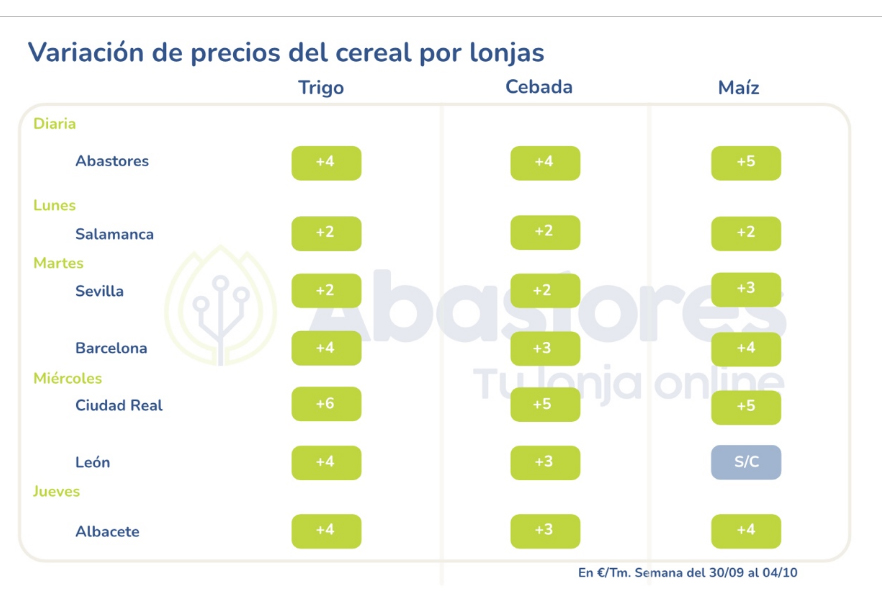 En el mercado nacional, el trigo en la Lonja de León ha alcanzado los 210€/Tm, una cifra que no se veía desde el 13 de junio, marcando su valor máximo en los últimos cuatro meses. Tanto el trigo, como la cebada y el maíz, han registrado incrementos superiores a los 4€/Tm en las principales lonjas del país, con algunas alzas de hasta 6 o 8€/Tm en el mercado nacional.