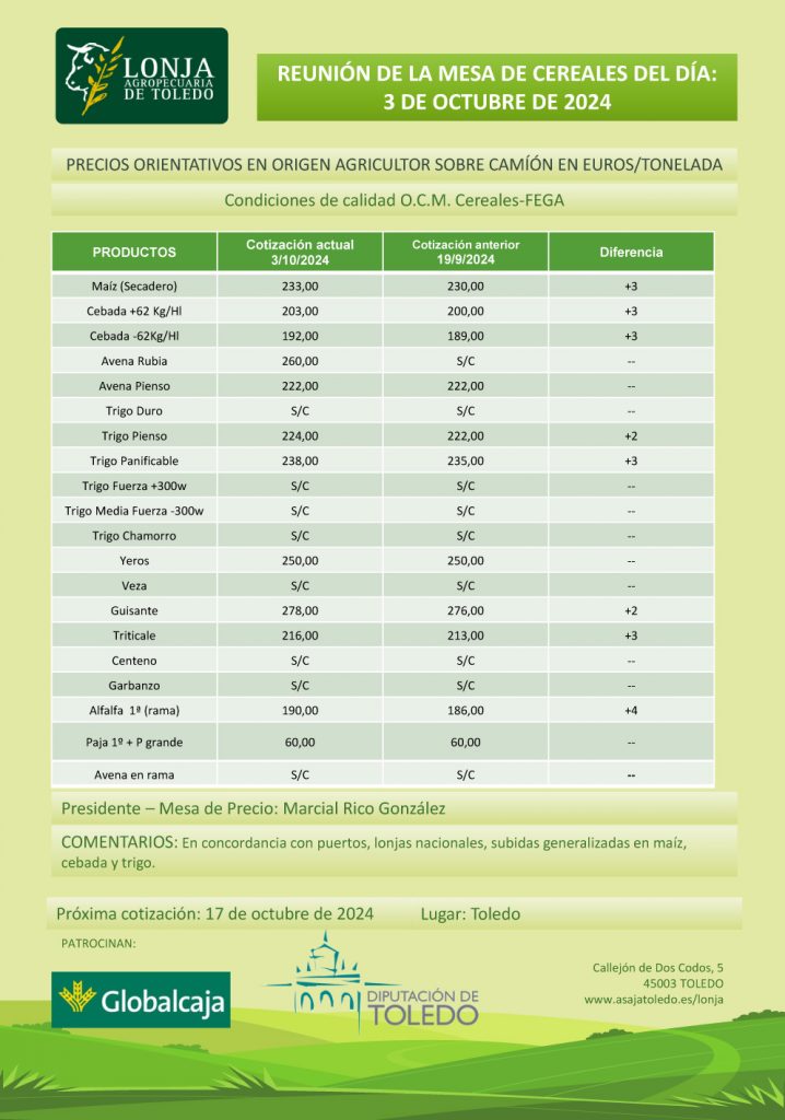 Lonja Agropecuaria de Toledo. Cereales. 3-octubre-2024
