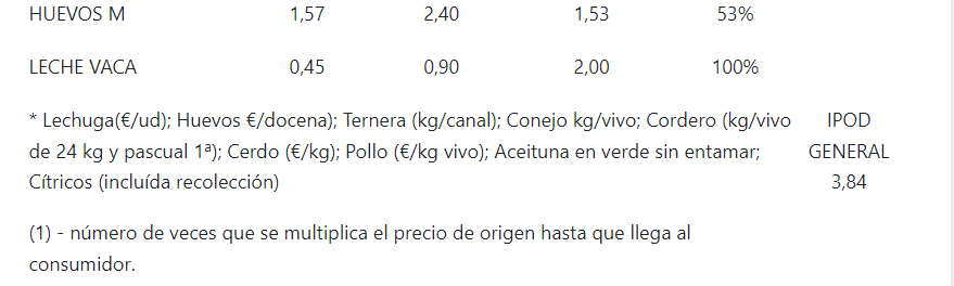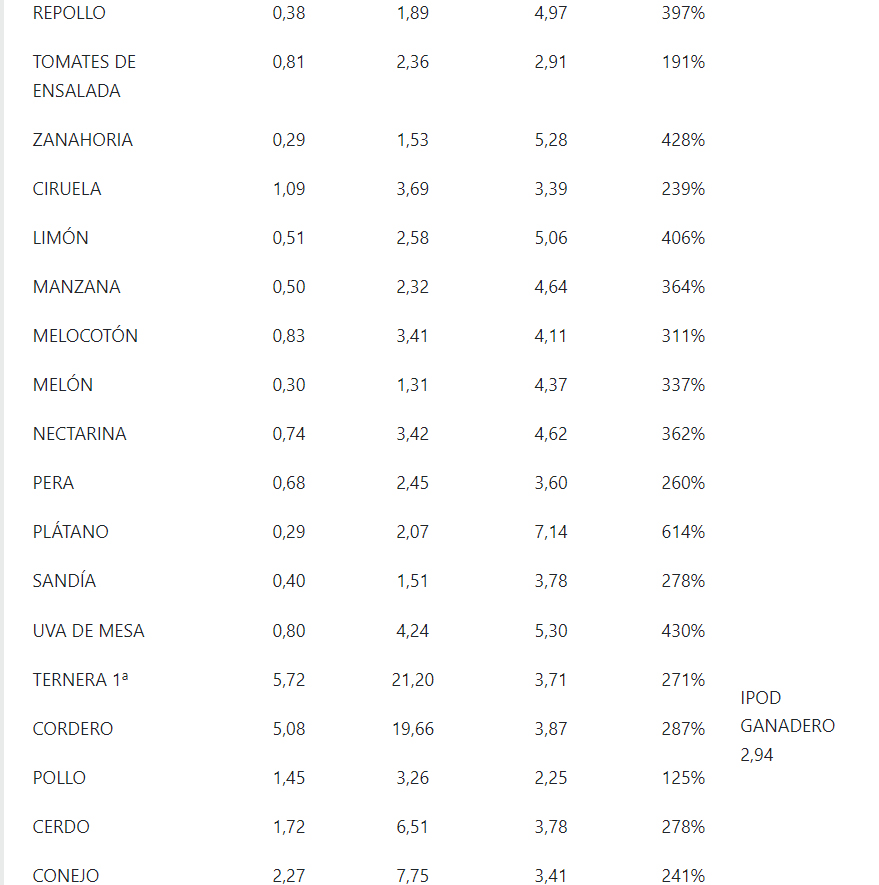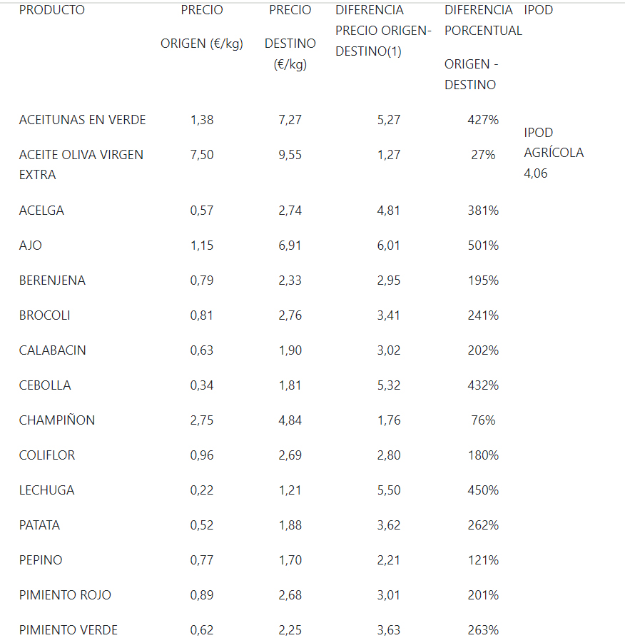 EFEAGRO. El precio de los alimentos subió un 284 % desde su origen en el campo hasta el consumidor final el pasado septiembre, es decir, casi se cuadruplicó entre origen y destino, según el último informe del Índice de Precios en Origen y Destino (IPOD) que ha difundido este martes la organización agraria COAG.