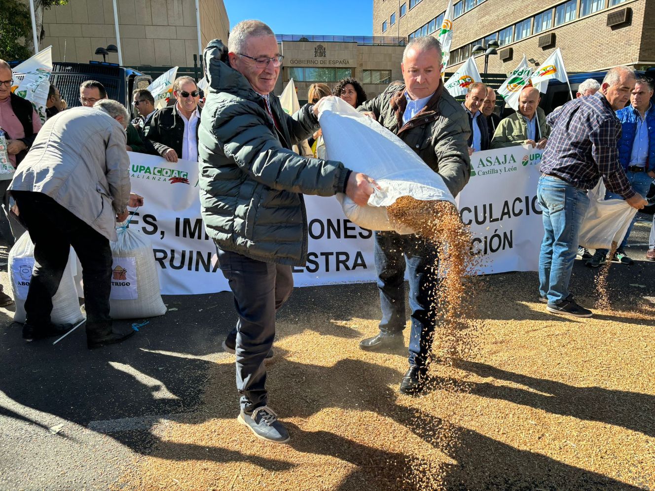 Durante la concentración han derramado varios sacos de trigo, para subrayar “el sinsentido de que hoy un saco de abono valga más que lo que nos pagan por tres de trigo”, ha denunciado el presidente de ASAJA de Castilla y León, Donaciano Dujo.