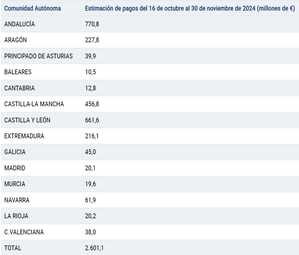 El Ministerio de Agricultura, Pesca y Alimentación adelanta a partir de este miércoles 16 de octubre, y hasta el 30 de noviembre, 2.600 millones de euros a los organismos pagadores de las 14 comunidades autónomas que han solicitado fondos para realizar el pago de los anticipos a los beneficiarios de las ayudas directas de la Política Agraria Común (PAC) correspondientes a las solicitudes de ayuda presentadas en 2024.