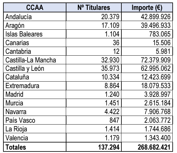 Este nuevo y último pago se suma a los ya realizados, por lo que la cantidad total abonada por esta ayuda extraordinaria es de 268,7 millones de euros, repartida entre 137.294 titulares de explotaciones agrícolas.