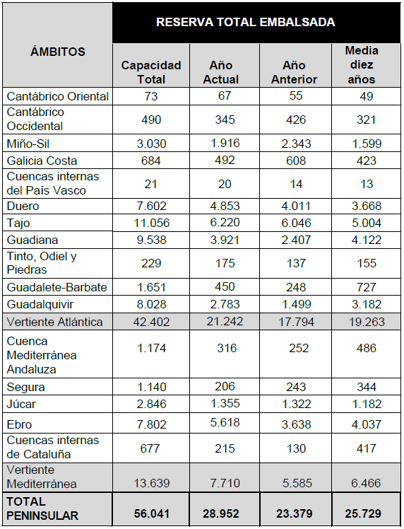 La reserva hídrica española está al 51,7% de su capacidad total. Los embalses almacenan actualmente 28.952 hectómetros cúbicos (hm³) de agua, aumentando en la última semana en 917 hectómetros cúbicos (el 1,6% de la capacidad total actual de los embalses).