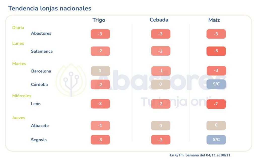 Los números rojos vuelven a las tablas del cereal en España. Todas las lonjas nacionales han registrado caídas, con el trigo perdiendo -3€/Tm y el maíz cayendo hasta -7€/Tm en la Lonja de León.