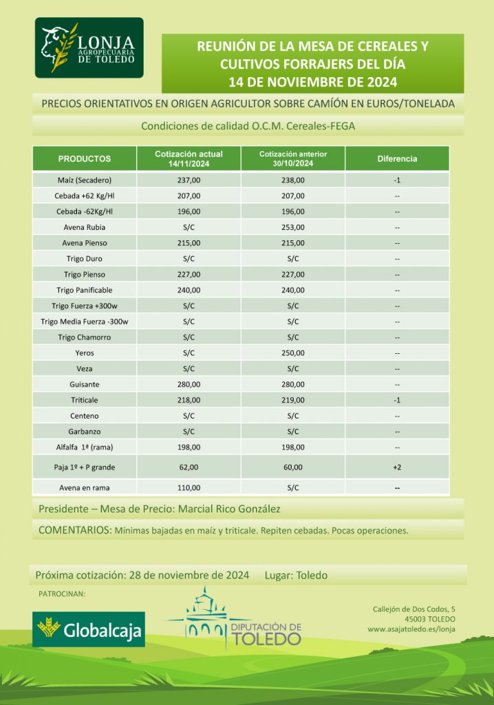 Lonja Agropecuaria de Toledo. Cereales. 14-noviembre-2024