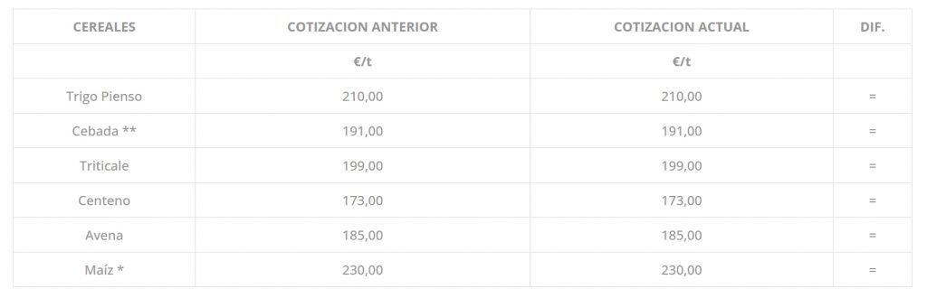 Por otra parte, en la sesión de la lonja de este miércoles se han recogido repeticiones en todas las categorías de cereales.