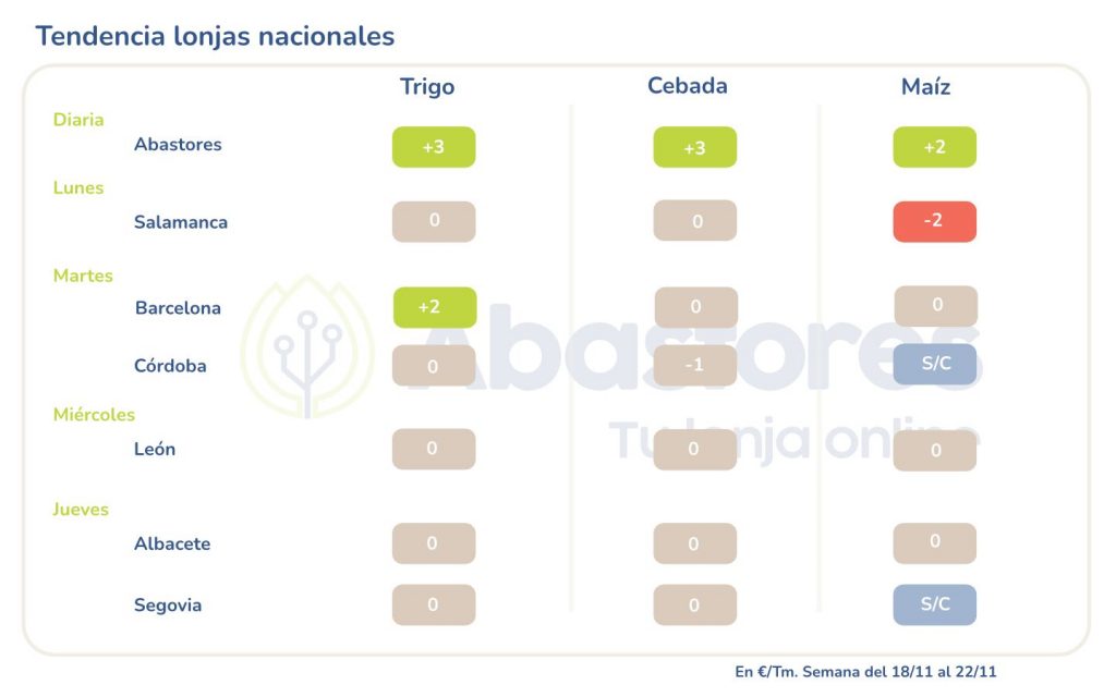 Según datos recopilados por Abastores, las lonjas nacionales de cereales han mostrado una tendencia estable con repeticiones y el mercado nacional e internacional han subido ligeramente