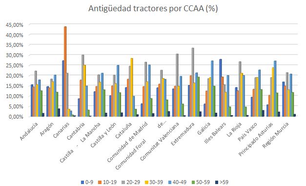 Las comunidades autónomas de Asturias, Galicia y Madrid, serían las que mantienen un parque más envejecido con un 80% o más de tractores por encima de los 20 años.