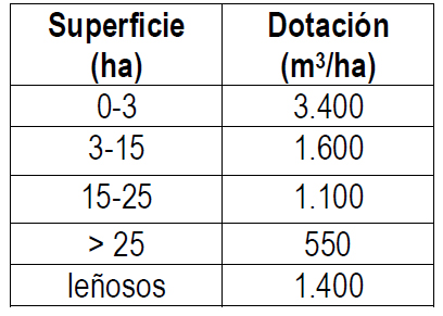 Se mantienen las dotaciones de 1.350 m³/ha para cultivos leñosos y 1.800 m³/ha para cultivos herbáceos. Así mismo se recomienda a las Entidades Locales reducir las dotaciones de abastecimiento, domésticos y los usos industriales y ganaderos en un 10%.
