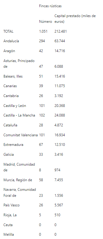 EFEAGRO. El número de hipotecas sobre fincas rústicas firmadas en España el pasado mes de octubre ha sido de 1.051, lo que representa un ascenso del 47 % en comparación con el mismo mes de 2023, ha informado este viernes el Instituto Nacional de Estadística (INE).