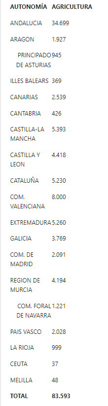 Por comunidades autónomas, Andalucía ha registrado en diciembre las cifras más altas de desempleo en agricultura, con 34.699 personas, seguida de la Comunidad Valenciana (8.000).