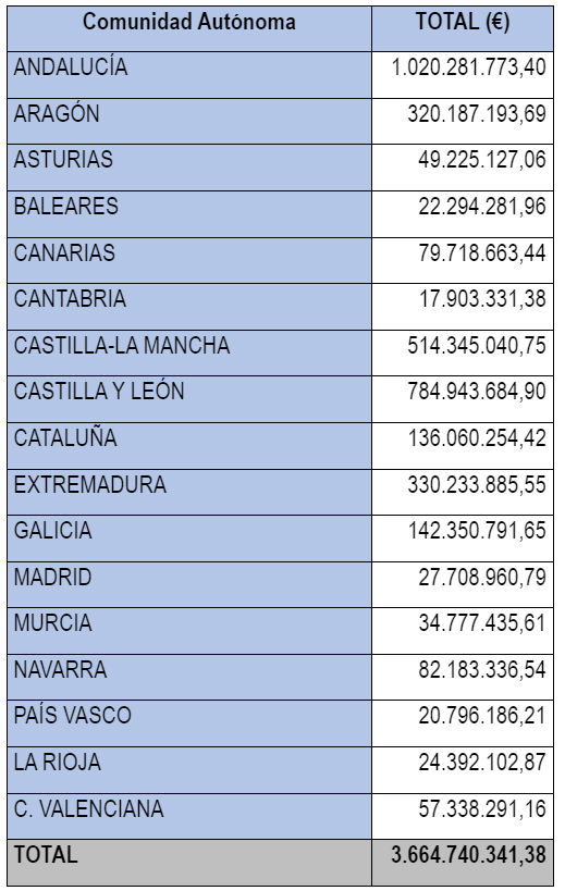 A continuación, se incluye una tabla con la distribución por comunidades autónomas de los pagos ya realizados de las ayudas directas de la campaña 2024, a fecha 31 de diciembre de 2024. Estos pagos incluyen, tanto los pagos anticipados como los pagos del saldo del periodo ordinario realizados hasta final de año.