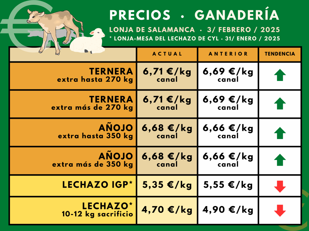 Por lo que respecta al bovino de carne, la Lonja de Salamanca registró este lunes 2 de febrero una ligera subida de dos céntimos por kilo en las canales de terneras y añojos. La subida es inferior a la de las últimas semanas, pero hay que recordar que en la anterior sesión se habían regularizado los precios para recortar el evidente desfase con respecto a las operaciones reales de mercado y las tablillas de otras lonjas.