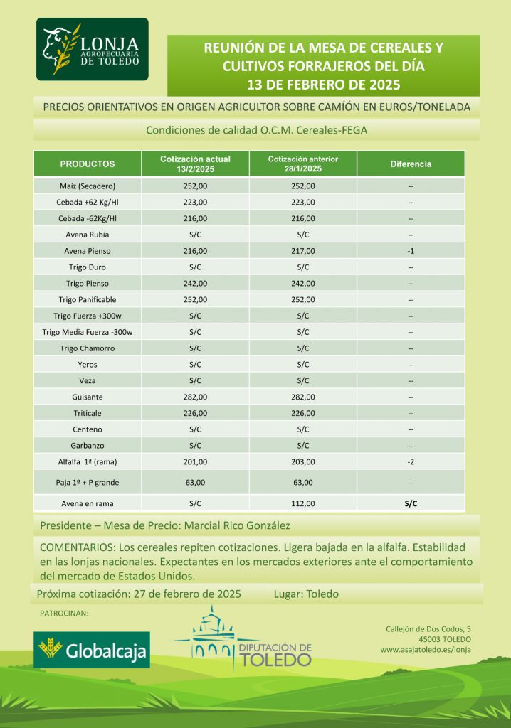 Lonja Agropecuaria de Toledo. Cereales. 13-febrero-2025