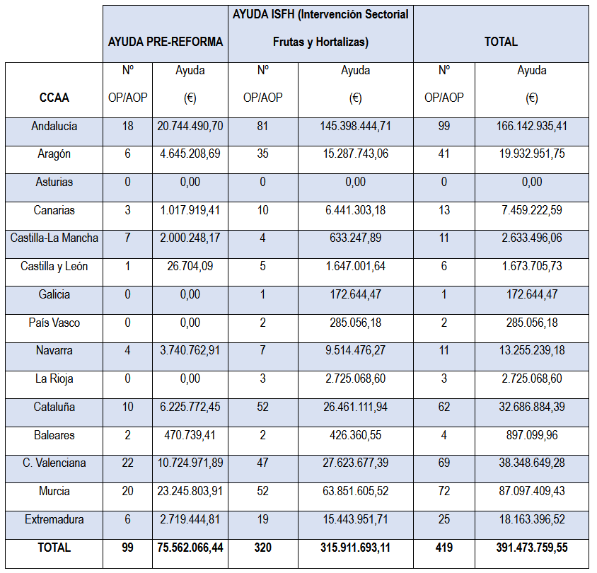 Las beneficiarias de estos fondos serán 419 organizaciones de productores repartidas en 15 comunidades autónomas. Los mayores importes corresponden a Andalucía, Murcia, Comunidad Valenciana, Cataluña, Aragón, Extremadura y Navarra.