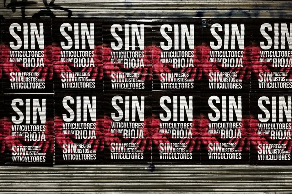 “Sin viticultores no hay Rioja y sin precios justos no habrá viticultores’. Así rezaban los carteles que ARAG-ASAJA ha pegado en las inmediaciones de la sede de Grupo Rioja y de Bodegas Familiares en Logroño este viernes.