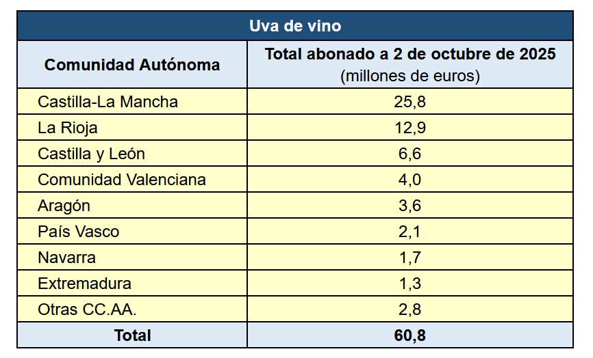 Este jueves se abonan casi 12 millones a viticultores asegurados en todas las zonas productoras e incorpora ya a zonas de producción tardía, como Álava (2,1 millones). Con este pago, Agroseguro alcanza los 61 millones abonados en la campaña actual de uva de vino, casi el 90% de la estimación final de daños, que se situará cercana a los 70 millones.