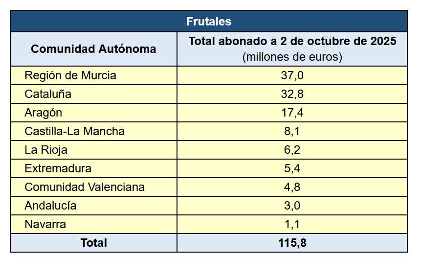 Esta semana, además, se inicia el pago de siniestros registrados en la línea de seguro de frutos secos, con 6,9 millones. Corresponden, principalmente, a productores de Castilla-La Mancha (4,1 millones), Región de Murcia y Comunidad Valenciana (cerca de 1 millón cada una).