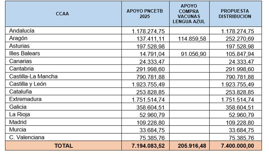 El importe restante, 205.916 euros, se destina a Aragón y Baleares, para apoyar la adquisición de vacunas frente a los nuevos serotipos de lengua azul detectados durante el año 2024.