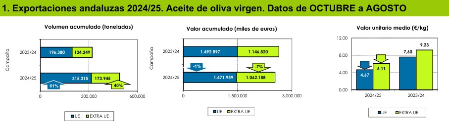 La tendencia mensual de las exportaciones al mercado europeo es diferente a la pasada campaña. El virgen representa el 65 % (en volumen) y el 84 % (en valor) de las exportaciones de aceite de oliva en los once meses de campaña.