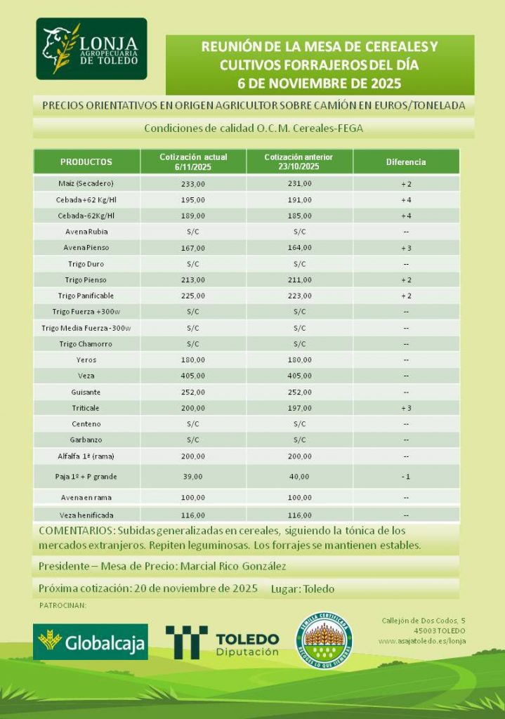 Lonja Agropecuaria de Toledo. Cereales. 6-noviembre-2025