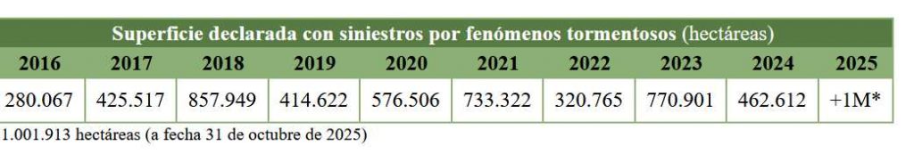 En 2025, las tormentas han descargado de manera recurrente a lo largo de todo el año, agravándose notablemente durante los meses de mayo, junio (con 460.000 hectáreas siniestradas durante el mes) y julio, si bien la cifra del millón de hectáreas se ha alcanzado a finales de octubre tras las tormentas puntuales registradas en diferentes puntos de la península.