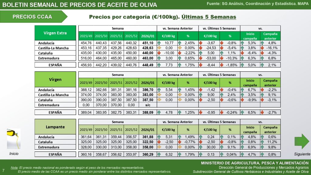 Los precios se refieren a venta de aceites de la actual, ya que apenas hay operaciones de la anterior campaña, una vez que se ha generalizada la recolección en las principales zonas productoras.
