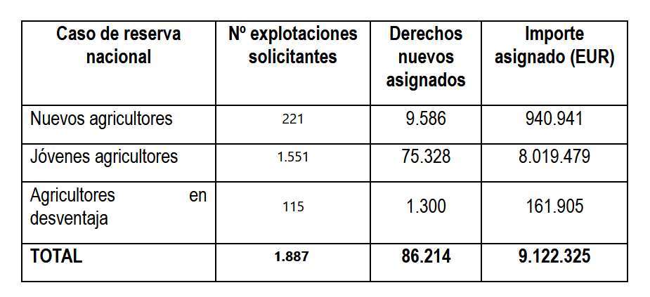 También se han concedido derechos a 221 nuevos agricultores, por un importe total de 940.941 euros, con una asignación media de 4.258 euros por beneficiario.