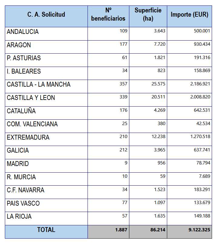 Este importe, abonado a través del Fondo Español de Garantía Agraria (FEGA), beneficia a un total de 1.887 agricultores y ganaderos -de los cuales, 357 son de Castilla-La Mancha-, con una ayuda media de 4.834 euros por beneficiario, y llega a 86.214 hectáreas, según un comunicado del Ministerio.